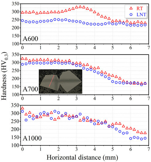 To understand the effect of the microstructure on the Charpy impact properties at RT and LNT, the A600, A700, and A1000 specimens were further investigated. Figure 5 shows the microhardness plot as a function of depth in the intermediate fracture surface of the Charpy V-notch impact specimens. The microhardness test region is highlighted with a red line in the inset map of Figure 5. The hardness test direction is in the direction normal to the crack propagation direction. The hardness underneath the fracture surface of the A600 specimen at RT was higher than that at LNT, indicating more deformation at RT during impact. In the A700 specimen, the difference between the microhardness values at RT and LNT decreased. In turn, the microhardness values of the A1000 specimen were close to each other. The microhardness near the fracture was about HV 340 higher than the initial HV 150, suggesting extraordinary work hardening during the impact process. The trend of hardness was consistent with the impact results. The increase in hardness values underneath the fracture surface was assumed to be related to the formation of high-density twins and dislocations, which contributed to work hardening [36]. However, the detailed microstructure-based strengthening [37,38] and toughening mechanisms [39] at RT and LNT need further detailed and systematic investigations, taken into account not only the grain size effect but also the strain gradient effect, by advanced characterization methods including in-situ techniques [40].