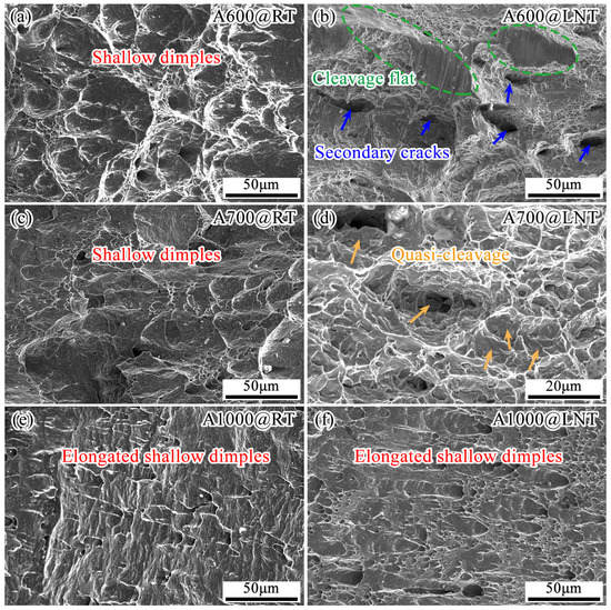 Figure 6 shows the SEM fractographs of impacted specimens. The A600 specimen exhibited shallow dimples on their fracture surface at RT (Figure 6a), while cleavage and many secondary cracks were found at LNT (Figure 6b). In the case of the A700 specimen, the fracture surfaces impacted at RT also demonstrated multiple dimples, but a quasi-cleavage fracture surface was observed in the sample after impact at LNT. The above results indicate that the fracture mode in the A600 and A700 specimens was transformed from ductile fracture to cleavage or quasi-cleavage fracture as the temperature decreased from RT to LNT. It should be noted that the fracture morphology of the A1000 specimen (Figure 6e,f) contained ductile fracture features with a large number of elongated, shallow dimples independently of the impact temperature.