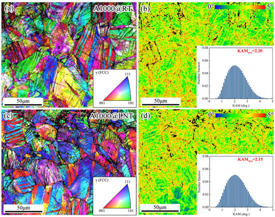 The specimens for microstructure characterization were extracted from the vertical–sectional (RD × ND) regions close to the fracture surface of impact-tested samples. The deformed microstructures of the specimens at the depth of about 200 μm from the intermediate fracture surface were examined using EBSD, and the corresponding images are shown in Figure 7, Figure 8 and Figure 9. Figure 7 shows the IPF and the corresponding kernel average misorientation (KAM) maps of the A600 specimen after impact tests at RT and LNT where no deformation twins have been observed. The average KAM value is a signature of local misorientation, and the higher the KAM value is, the heavier the plastic deformation is [9]. The average KAM values of the A600 specimen at RT and LNT were calculated to be 1.48 and 0.97, respectively. Obviously, the A600 specimen underwent severe plastic deformation in a uniform manner during the impact at RT (see Figure 7b,d). In turn, a heterogeneous KAM distribution was observed in the A600 specimen after LNT impact. While the recovery microstructure zones exhibited the highest KAM values, the recrystallized regions possessed the lowest KAM values, indicating the non-uniformity of strain distribution. Moreover, micro-cracks formed at the boundaries of the recovery microstructure due to the stress concentration during the impact process at RT (see Figure 7a,b). Once the test temperature was reduced from RT to LNT, cracks might propagate along the recovery microstructure (see Figure 7c,d), resulting in lower impact energy. It was inferred that the lower impact energy of the A600 specimen with a partially recrystallized microstructure could probably be due to the stress/strain concentration in the recovery microstructure. The detailed processes for crack initiation in the heterogeneous microstructure need further detailed investigations, and these may be directly related to the interactions between dislocations and boundaries during deformation [41].