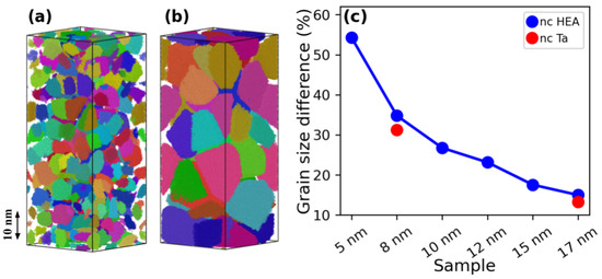Grain segmentation for the (a) 8 nm and (b) 17 nm samples. (c) Comparison of the real and nominal grain diameters for the nc HEAs and nc Ta at zero strain. Random coloring was used in grains for visualization.