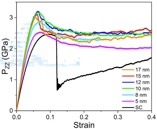 Tensile stress–strain plots for all our simulations with different grain sizes, together with the SC case, are shown in Figure 2. These curves present a linear quasi-elastic regime, followed by a non-linear elastic regime, which ends with a stress drop due to dislocation and twin nucleation, and finally a stress plateau. The SC also shows linear and non-linear elastic regimes. Typical interatomic potentials include complex interactions with a force-displacement response, which is generally non-linear even at relatively low strains, despite being completely reversible upon release and, therefore, elastic.