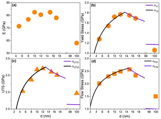 (a) Elastic modulus (E), (b) yield stress, (c) ultimate tensile stress (UTS), and (d) flow stress. A single crystal result is given as having a grain size of 100 nm. Lines indicates a Hall–Petch and inverse Hall–Petch fit.