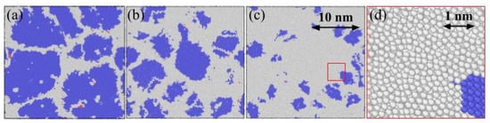 Snapshots at 0.4 strain for (a) 17 nm, (b) 8 nm, and (c) 5 nm. (d) Detail of (c) particle distribution evidencing crystalline and non-crystalline structures. Only a slice 0.5 nm thick is shown. PTM (blue = bcc and gray = others).