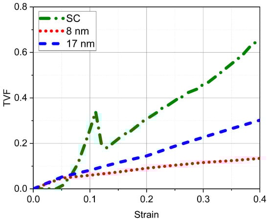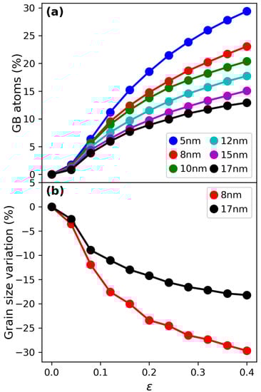 GB evolution was explored by means of the number of GB atoms as well as grain-size variation. Figure 6a shows that, the smaller the grain size is, the larger the increase in the number of GB atoms. Calculation of grain-size variation results in the curves shown in Figure 6b. As expected, grain-size variation is more noticeable in the case of the 8 nm sample, where a reduction of almost 30% is reached at 0.4 strain. In contrast, the reduction in the 17 nm sample is only of 15%. The number of grains remains unchanged during deformation.