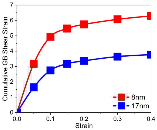 To quantify the activity in GBs, we performed an analysis similar to the one implemented by Ke [73]. First, we kept only GB atoms and then we performed atomic shear strain calculations using OVITO with the sample at zero strain as reference. In Figure 7, we observe the cumulative shear strain for two samples at different strains. By cumulative, we mean the total atomic shear from all GB atoms. The smaller the grain size is, the larger the GB activity because smaller grains slide and rotate more easily. This higher GB activity in smaller grains was also observed for nc Ta [20].