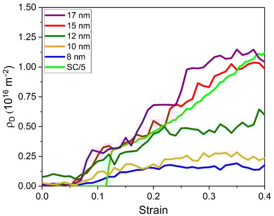 Dislocations are observed inside grains, as shown in Figure S4, which also shows dislocations inside the single crystal. In Figure 8, we calculate dislocation density for all cases using the formula , where L is the total dislocation length obtained using DXA and V is the volume of the sample. Figure 8 shows that the larger the grain size, the higher the dislocation density. This is different if we compare with fcc HEA MD simulations [27,69]. One crucial difference is that fcc nanograins usually deform by emitting mostly a large number of partial dislocations with stacking faults behind [16], while for bcc nanograins, there are full dislocations involved in deformation. We find dislocation densities in the range of –. This is lower than the ones found for the medium-entropy alloy NbTaZr [35]; however, this could be due to the lower strain rate in our simulations.