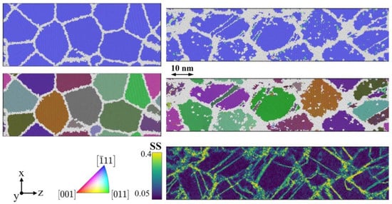 A slice of the sample at 0.24 strain was inspected using OVITO and its common neighbor analysis (CNA) tool. Although CNA can recognize crystal structures, such as bcc, fcc, and hcp, it fails to distinguish twins and GBs. From visual inspection, GB atoms were manually selected using OVITO with the support of CNA, and isolated from the rest as shown in Figure S1 in the Supplementary Materials.