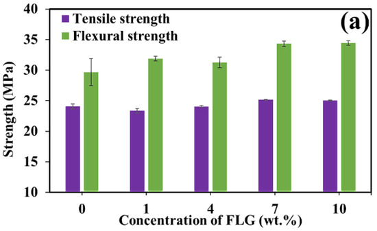 Both elongation at break and tensile toughness of the FLG-filled composites decreased as the FLG concentration increased, as can be seen in Figure 2d. This is a common effect of the addition of rigid fillers and has been reported in the literature [12,31].