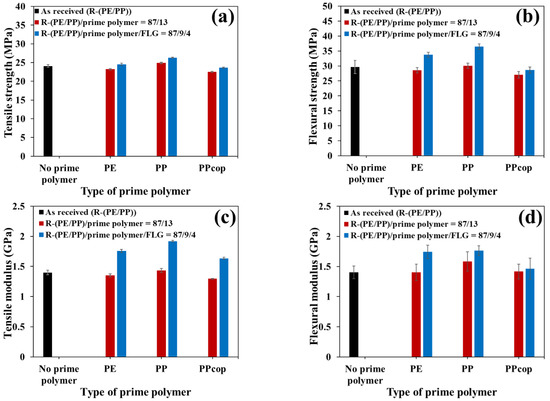 As observed in Figure 3a–d, the Type 3 composite containing both the prime polymer (PE or PP) and FLG presented higher tensile and flexural properties than that of the neat R-(PE/PP) and respective Type 2 samples. For example, with 4 wt.% FLG and 9 wt.% PP, the flexural strength of Type 3 was 21% higher than the corresponding one of the Type 2 composite with 13 wt.% PP.