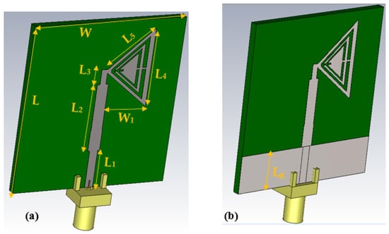 Geometry of proposed dual-band compact antenna: (a) front view, (b) back view.