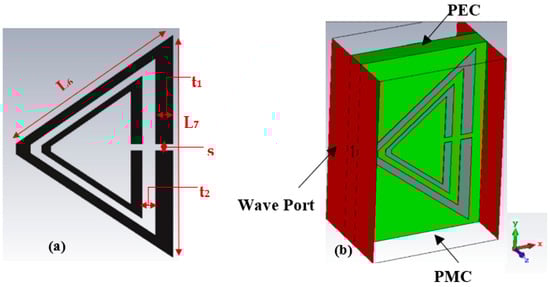 Initially, the triangular split ring resonator (TSRR) CST simulation model shown in Figure 2b was printed on an FR4 substrate (h = 1.6 mm, εr = 4.3, tan δ = 0.025). The unit-cell was a metallic material printed on an FR4 substrate. The unit-cell design and analysis were carried out using CST-Microwave Studio. For the design in CST, perfect boundary conditions (PBCs) were applied to the unit-cell, which consisted of only one TSRR and had two sides that were perfect electric conductors (PECs) along the y-axis, and two perfect magnetic conductors along the z-axis (PMC). For excitation and radiation purposes, the other two sides of the unit-cell (along the x-axis) were utilized for the wave ports [].