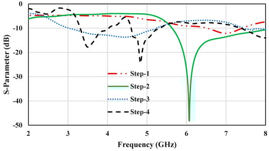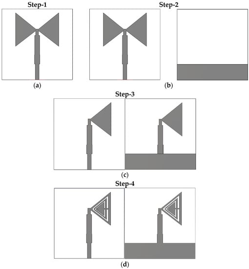In Figure 3a–d, we present the step-by-step design of the antenna. The antenna design started with a triangular patch bow-tie structure printed on the top layer, and the bottom layer was the complete ground plane shown in Figure 3a. It is shown in Figure 4 that the antenna resonated between 6.5–7.4 GHz in Step 1 at the center frequency of 7 GHz, and the design was simulated using CST Microwave Studio. In Step 2, the complete ground was modified to a partial ground plane, as shown in Figure 3b. This helped to improve the bandwidth from 900 MHz to 2.4 GHz compared to Step 1. The antenna resonated between 5.6–8 GHz in Step 2. In Step 3, one of the triangular patches was moved to the ground plane, as shown in Figure 3c. This helped to shift the frequency range, and the antenna operated between 2.9 and 5.2 GHz in Step 3. In Step 4, as shown in Figure 3d, a TCSRR structure was etched on the triangular patches. This introduced a notched band between 4 and 4.6 GHz, and the antenna showed dual-band behavior. In Step 4, the final design of the proposed antenna resonated at 3.3–4 GHz and 4.6–5.3 GHz. Therefore, the antenna showed dual-band behavior. The antenna resonating frequency at each step shown in Figure 4. The proposed antenna’s initial resonant frequency operated at 3.5 GHz, while its second frequency operated at 4.9 GHz, covering the sub-6 GHz 5G spectrum and the public safety band. A conventional microstrip patch antenna’s (MPA) overall size is 50 × 40 mm2 []. The dimensions of the proposed antenna are 36 × 36 mm2, which shows that the size was reduced by 35.2% compared to a conventional MPA.