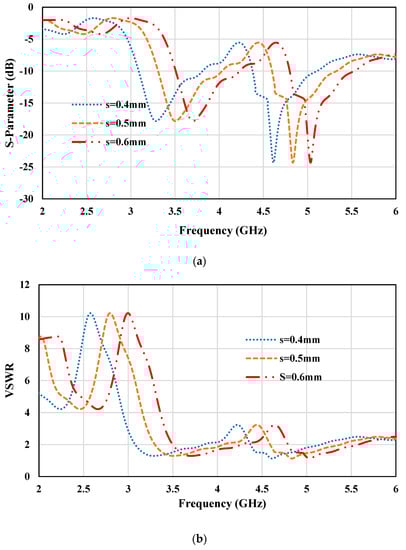 This section discusses the simulation studies that varied the TCSSR slot widths “s” used for the band notch function. The return-loss and VSWR characteristics for s = 0.4, 0.5, and 0.6 mm are shown in Figure 5a,b. The operating frequency and notch band for different values of s are shown in Table 2. Table 2 shows that increasing the slot width s enhanced the notch band range, while reducing s resulted in a drop in the notch band range, but at the same time, caused the antenna’s center frequency to deviate from 3.5 GHz and 4.9 GHz. The 3.5 GHz and 4.9 GHz center frequencies operate in the 5G and the public safety bands, respectively. Reducing the notch band range created interference between the 5G and the public safety bands. Thus, the optimal operating range and rejecting frequency band were achieved at s = 0.5 mm. The antenna operated between 3.3–4 GHz and 4.6–5.3 GHz, and the rejection band was between 4 and 4.6 GHz at s = 0.5 mm. The 600 MHz rejection bandwidth was sufficient to avoid interference between the two operating frequency bands mentioned above.