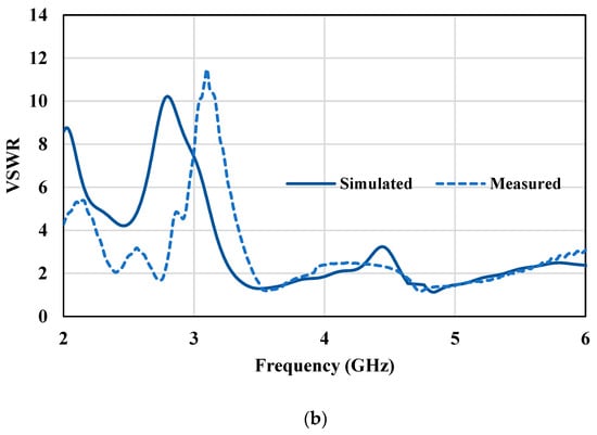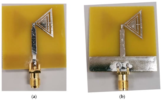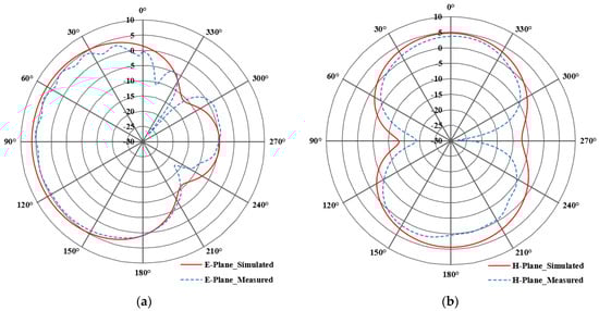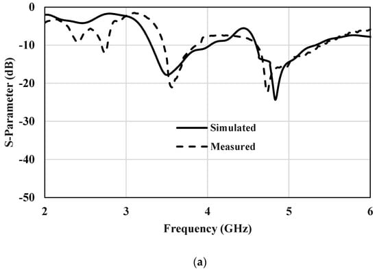There was a slight deviation between the simulated and measured return loss results, as shown in Figure 7a,b. This slight discrepancy was primarily due to the fabricated antenna substrate loss tangent and the effect of SMA soldering []. This fabrication error could be solved in future by using a high-end low-loss Rogers substrate and precise soldering.