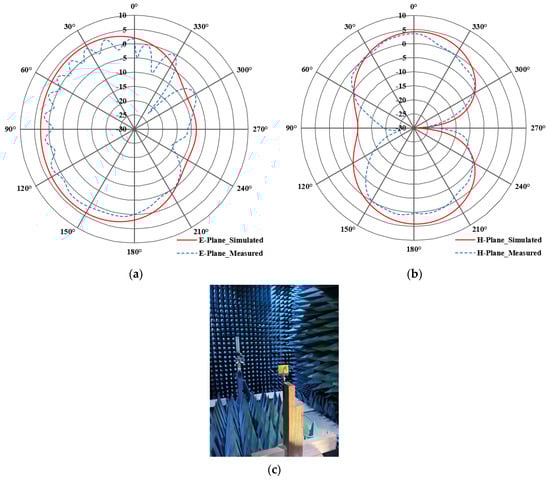 Simulated radiation pattern of the proposed antenna at 4.9 GHz: (a) E−Plane, (b) H−Plane, (c) radiation pattern measurement setup.