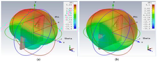 The 3D radiation patterns of the proposed antenna at 3.5 GHz and 4.9 GHz are shown in Figure 10a,b. It can be seen from Figure 10 that the proposed antenna achieved a maximum gain of 5.64 dBi and 4.1 dBi at 3.5 GHz and 4.9 GHz, respectively.