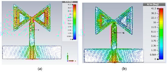 The simulated current distribution for the proposed bowtie antenna at the center frequencies of 3.5 GHz and 4.9 GHz is shown in Figure 11a,b. This helps to understand the reasons for the dual-band behavior of the antenna. Higher and lower current distributions in the antenna are represented by red and blue, respectively, in Figure 11. As can be observed in Figure 11a, at 3.5 GHz, the current was more dominant along the TCSRR of double-sided triangular patches and edges of the modified stepped feedline. The current flows were oppositely directed along the TCSSR edges. According to Figure 11b, at the center frequency 4.9 GHz, the current flows were more dominant around the edges of TCSRR etched from the triangular patch in the ground plane and across the feedline.