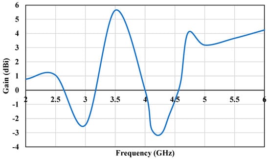 Figure 12 depicts the peak gains of the proposed antenna in the frequency range of 2–6 GHz. The proposed antenna had a gain of 5.64 dBi and 4.1 dBi at 3.5 GHz and 4.9 GHz, respectively. As illustrated in Figure 12, there was a substantial reduction in the maximum gain in the notched frequency region between 4 GHz and 4.6 GHz. The antenna gains at frequencies beyond the notched frequency band ranged from 3 dBi to 5.64 dBi.