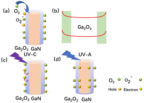 - Zhang, L.Y.; Li, Y.W.; Xiu, X.Q.; Xin, G.Q.; Xie, Z.L.; Tao, T.; Liu, B.; Chen, P.; Zhang, R.; Zheng, Y.D. Preparation of vertically aligned GaN@Ga2O3 core-shell heterostructured nanowire arrays and their photocatalytic activity for degradation of Rhodamine B. Superlattices Microstruct. 2020, 143, 106556. [Google Scholar] [CrossRef]