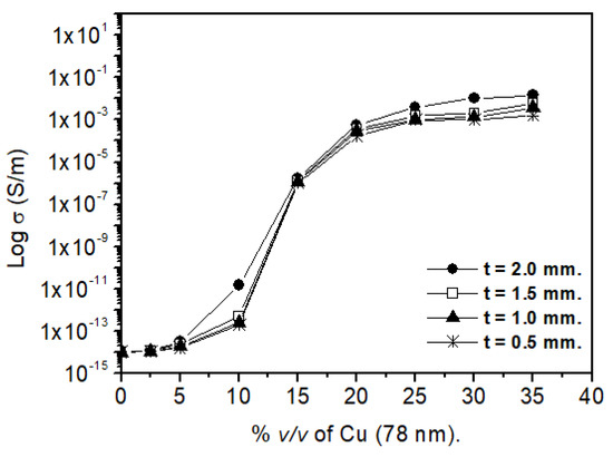 The result analysis carried out to study the electrical behavior of the composites are presented in Figure 1 and Figure 2. Figure 1 shows the percolation curve (Log (σ) vs. % v/v of Cu) for different thickness sample composites of PMMA–Cu (3.25–4.75 μm). The variation of the critical volumetric concentration was observed (fC) as a function of the thickness sample. While the thickest samples (2.0 mm) appeared to percolate at ~10 % v/v, the thinnest samples (0.5 mm) required more filler to reach percolation. The conductivity values were approximately 1.5 × 10−6 S/m for t = 2.0 mm for concentrations close to the percolation threshold (10 % v/v) in the PMMA–Cu (3.25–4.75 μm) composites (Figure 1). In addition, 5 × 10−12 S/m was observed for t = 0.5 mm. This effect was much less pronounced for the PMMA–nanometric copper particles (78 nm) composites shown in Figure 2. In this picture, the thickness of the analyzed samples produces small variations in conductivity values. For the concentrations close to the percolation threshold (10 % v/v), the values of conductivity were 1.5 × 10−11 S/m for t = 2.0 mm and 2 × 10−13 S/m for t = 0.5 mm. Additionally, figures N°1 and N°2 show that the increase in thickness of each sample produces an increase in its volumes, and therefore a greater number of contacts between metallic particles is generated, increasing the electrical conductivity of the composites. Table 3 shows a summary of the critical volumetric concentration for both composite types. According to the obtained results, we can point out that when the average size of filler particle (d) diminishes in relation to the thickness of sample (t), the limitations imposed by the geometry of the composites are less severe. In the percolation site, the probability of generating a percolation path is always greater for a particle immersed within the composite than for a particle located on the surface, because a larger number of new possible pathways exist (larger number of adjacent sites). As the t/d ratio becomes smaller, a higher percentage of particles occupy positions closer than the surface of the composite. Similar results have been obtained by Ruschau in the system conformed by silica filled with silver particles [34].