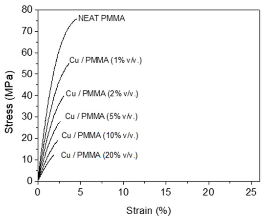 In Figure 6 and Figure 7, due to 78 nm copper particles infiltration, a clear difference can be observed when they are compared with micrometric-size particles. In the composite conformed by nanometric-sized copper particles (Figure 6), the addition of up to 2% v/v of metallic filler originates a significant increase of the strain-to-failure percentage. For composites with 2% v/v nano copper filler, this increase reaches approximately 450% whit respect to the values obtained for PMMA without metal filler.