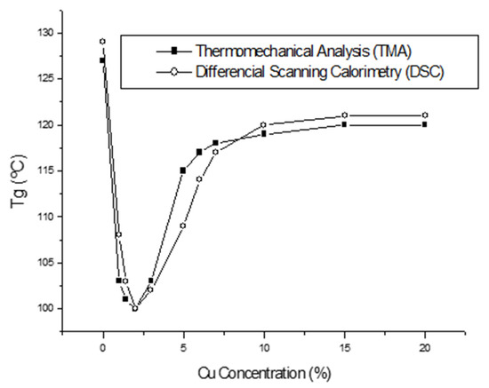 One benchmark commonly used to compare the thermal behavior of composites is the glass transition temperature (Tg). Different behaviors of this parameter as a function of the filler content have been reported by various authors. Some researchers reported an increase in the Tg as a function of filler concentration [25,26]; however, decreases in this parameter have also been reported [5,27]. The interaction between polymer chains and the surface of the particles can create changes in the kinetics of the chains surrounding the particles of the filler due to the presence of the interface. This change is more significant when the filler is of nanometric size because it has a very high superficial area. Even a well-dispersed system with a low filler concentration originates a great interfacial area for which the properties of the resultant material are hardly altered [28]. Through this union, the polymer restricts the mobility of the chains that have been affected, modifying both the structure and the orientation of the chains that surround the surface of the filler particle [29].