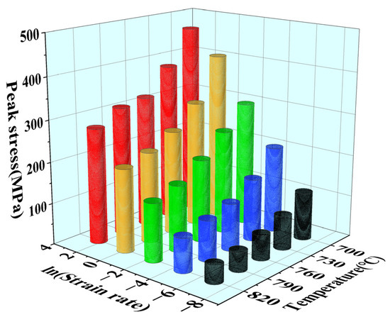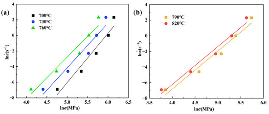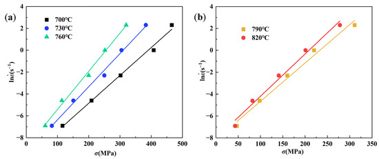 The peak stress is adopted to establish constitutive equations [30]. The values of peak stress are shown in Figure 2. Based on the values and σ values, the curves of ln − σ and ln − lnσ at different phase fields are drawn in Figure 3 and Figure 4, respectively.