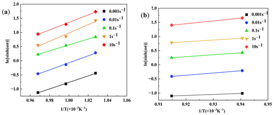 According to Equation (4), the values of Q can be obtained by calculating the partial differential between ln[sinh(ασ)]/1/T and ln/ln[sinh(ασ)]. Thus, the curves of ln[sinh(ασ)] − 1/T and ln − ln[sinh(ασ)] are drawn in Figure 5 and Figure 6, respectively.