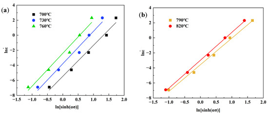 Curves of ln − ln[sinh(ασ)] at different phase fields: (a) α + β and (b) β.