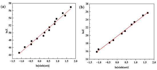 Moreover, lnZ can be calculated by taking the Q, T, and into Equation (6). Then the curves of ln[sinh(ασ)] −lnZ at α + β and β phase fields can be obtained as shown in Figure 7. The values of n are obtained from the slopes of the curves. The values of A can be obtained from the lnA of 49.13873 (α + β phase field) and 19.79592 (β phase field), which can be determined by the intercepts of the curves. The n and A are shown in Table 3.
