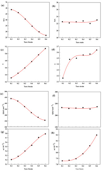 The method for establishing the constitutive equations under the peak strain described in Section 3.2.1 can be used to obtain the constitutive equation for other strains of 0.1–0.6. The relationship between model parameters and true strain was built to accurately predict the flow stress in the strain range of 0.1–0.6, as shown in Figure 8. According to Figure 8e,f, the values of deformation activation energy, Q, under different deformed conditions are shown in Table 4. The values of Q under all strains are always larger than the value of self-diffusion activation energy in both dual-phase and single-phase fields.