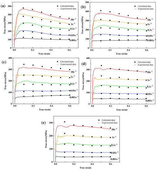 Predicted stress values and experimental stress values: (a) α + β phase field, 700 °C; (b) α + β phase field, 730 °C; (c) α + β phase field, 760 °C; (d) β phase field, 790 °C; and (e) β phase field, 820 °C.