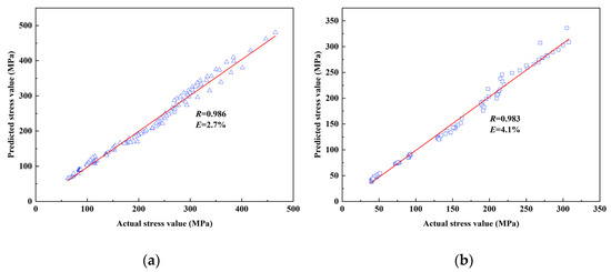 Correlation analysis between the actual stress values and predicted stress values at different phase fields: (a) α + β and (b) β.