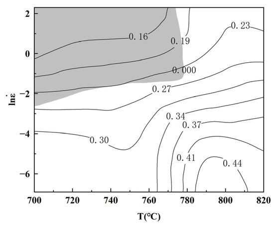 By superimposing the power dissipation map and rheological instability map, a processing map can be drawn. For the alloy at a strain of 0.6, the processing map is shown in Figure 11. At α + β phase field, the power-dissipation coefficient, η, enlarges from 0.16 to 0.41 with the increase of the deformation temperature. At the β phase field, η shows the same trend and increases to 0.44. Generally, a high value of η may indicate a region suitable for deformation because of the large power dissipation [23]. For the thermomechanical processing that occurred at the α + β phase field, the range of temperature from 780 °C to 790 °C and range of strain rate from 0.001 s−1 to 0.016 s−1 lead to a high η value. A similar region for thermomechanical processing occurred at the β phase field and had a range of temperature from 790 °C to 800 °C and a range of strain rate from 0.001 s−1 to 0.007 s−1. Compared with the two regions with a high power-dissipation-coefficient value, the η value of the β phase field is higher than that of the α + β phase field. This phenomenon indicates that the region with high power-dissipation-coefficient value of the β phase field may be more suitable for TMP. In addition, an instability region in the range of temperature from 700 °C to 780 °C, as well as the range of strain rate from 0.08 s−1 to 10 s−1, could be found. Under such TMP conditions, it may not be suitable for the high-temperature processing of the alloy.