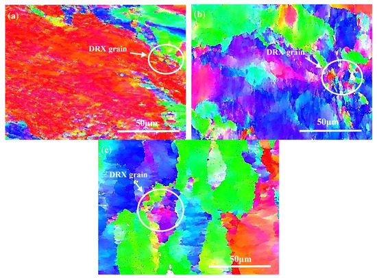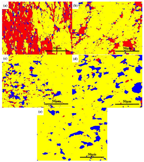 EBSD analysis of DRX at strain rates of 0.001 s−1: (a) 700 °C, (b) 730 °C, (c) 760 °C, (d) 790 °C, and (e) 820 °C.