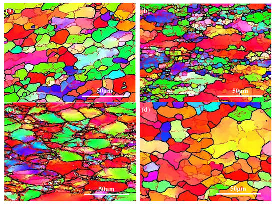 EBSD images of the deformed grains at β phase field: (a) 790 °C/0.001 s−1, (b) 790 °C/0.1 s−1, (c) 790 °C/10 s−1, and (d) 820 °C/0.001 s−1.
