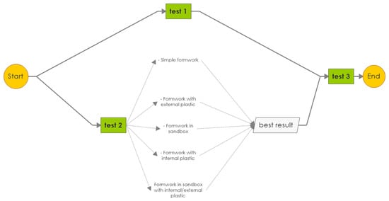 The material was subjected to a variety of manipulations of a circular nature, none of which modified the state of the material irreversibly (vitrification, firing, etc.). This facilitated its almost unlimited use in consecutive processes. As explained in Figure 3, three test rounds were conducted, the second round including several iterations.