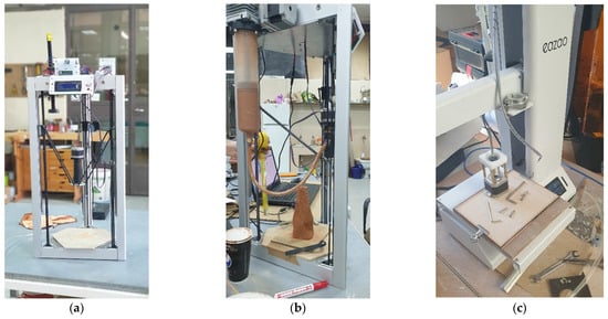 The extrusion system of both machines is similar, based on a Nema 27 stepper motor pushing a piston against the clay in the reservoir. The deposit capacity is 500 mL, which corresponds to approximately 800 g of clay. No compressed-air extruder system was used in any of these tests.