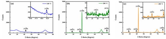 XRD patterns of Sb2Te thin films (200 nm) annealed at different temperatures: (a) 140 °C; (b) 200 °C; (c) 400 °C. The holding time is 30 min. The inset in (a) is an enlarged diffraction signal between 35.0° and 44.9°. The inset in (c) is a redrawn diffraction signal between 20.0° and 40.5°.