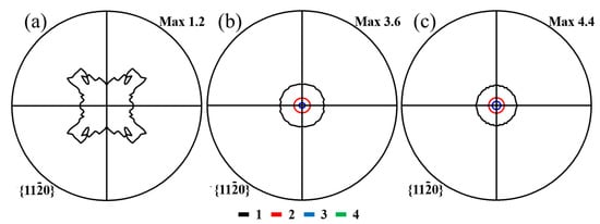 Figure 3 shows the crystallographic orientation mapping images and calculated and PFs of Sb2Te thin films annealed at 140 °C, 200 °C, and 400 °C. In orientation maps (Figure 3a–c), grains colored by red represent {0001} basal parallel to the thin film surface. The grains are marked in blue and green and possess and prismatic orientation. The and orientated grains dominate in Sb2Te thin film, indicating the formation of a sharp prismatic texture.