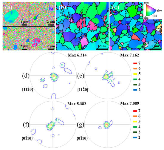 Orientation mapping images of Sb2Te thin films (200 nm) annealed at different temperatures: (a) 140 °C; (b) 200 °C; (c) 400 °C. The holding time is 30 min. Calculated and PFs counted from EBSD maps of Sb2Te thin films annealed at (d,f) 200 °C; (e,g) 400 °C. Panel (a) shows the four randomly captured crystallized regions. Different colors represent pole density levels: blue for 2, dark green for 3, light green for 4, yellow for 5, orange for 6, and red for 7. The maximum pole density is near the center of the calculated PFs.