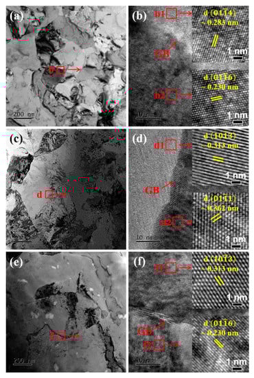 The previous results show the strong diffraction peaks of and planes in XRD patterns, numerous grains with and orientation in EBSD mappings, and high and pole densities in PFs. These suggest that Sb2Te thin films exhibit and prismatic texture. The orientation preference may be dictated by the phase transformation, surface energy minimization, and strain energy minimization. The inheritance of texture caused by the phase transition in alloys has been confirmed [17,18]. Phase separation leads to inhomogeneous composition, which may be the cause of orientation preference. Phase stability of Sb2Te thin film was considered firstly. XRD and EBSD analyses revealed the phase stability at the relative macro scale. TEM was utilized to observe the microstructure and lattice stability of Sb2Te thin film at the microscale. Figure 4a,c,e show the microstructure of Sb2Te thin films annealed at 140 °C, 200 °C, and 400 °C. The second phase precipitation is not observed. We captured the high-resolution phase contrast (HRTEM) images of lattices and grain boundaries (GBs) in Sb2Te thin film, and the inverse fast Fourier transform (IFFT) images were calculated. As shown in Figure 4b,d,f, several crystal planes of Sb2Te are indexed. It demonstrates the phase stability of Sb2Te thin films at different temperatures, in agreement with the results of XRD and EBSD.