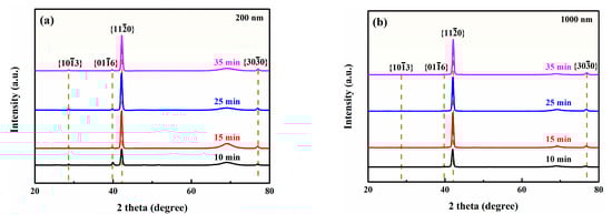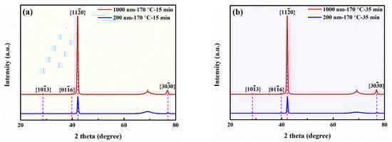 Figure 5 shows XRD patterns of 200 nm and 1000 nm Sb2Te thin films annealed at 10 min, 15 min, 25 min, and 35 min. We focus on the strong diffraction peak that is located at ~42.2°. In 200 nm Sb2Te thin film, the peak intensities of planes are 3038, 6603, 6667, and 6353 when annealed at 10 min, 15 min, 25 min, and 35 min, respectively (Figure 5a). It also occurs in 1000 nm Sb2Te thin film, in which the peak intensities are 15,922, 30,646, 30,708, and 30,895, respectively (Figure 5b). This indicates that Sb2Te thin film annealed at 10 min is partially crystallized. After annealing at 15 min, both samples are fully crystallized. Figure 6 shows XRD patterns of 200 nm and 1000 nm Sb2Te thin films annealed at 15 min and 35 min. All Sb2Te thin films exhibit four narrow diffraction peaks. Diffraction peaks emerge at ~28.7°, ~39.8°, ~42.2°, and ~76.9°, corresponding to , , , and planes. Table 2 gives the diffraction peak intensities. The peak intensities of the and diffraction planes in the 1000 nm Sb2Te thin film are clearly higher than those in the 200 nm thin film. It implies that 1000 nm Sb2Te thin film has a stronger and preference. More importantly, the and peak intensities of the two films are a little different. It means that the number of crystals involved in diffraction has a relatively weak effect on peak intensity. That is to say, the impact of film thickness on the diffraction strength is weak in the present result. Therefore, the degree of prismatic preference in 200 nm and 1000 nm Sb2Te thin films could be discussed by using reasonable annealing processes (170 °C: 15 min and 170 °C: 35 min).