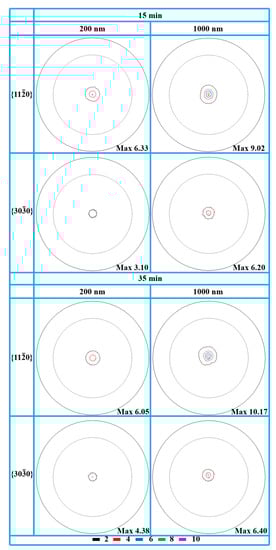 Measured and PFs of 200 nm and 1000 nm Sb2Te thin films annealed at 15 min (top panel) and 35 min (bottom panel). Different colors represent pole density levels: black for 2, red for 4, blue for 6, green for 8, and lavender for 10. The maximum pole density is near the center of the measured PFs.