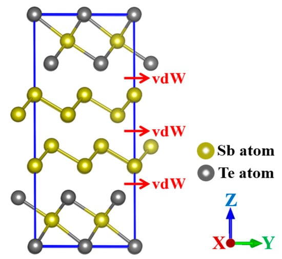 Schematic diagram of Sb2Te lattice. The space group of Sb2Te is P −3 m 1. There are van der Waals bonds along the c-axis. Sb atom is colored by brown and Te atom is marked by grey.