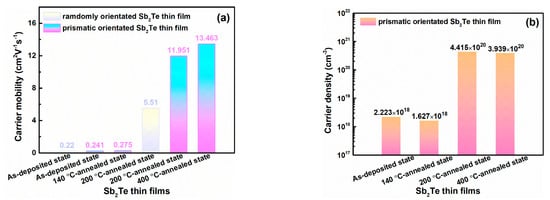 We investigated the electrical properties of prismatic textured Sb2Te thin film by using PPMS. Sb2Te thin film exhibits p-type conductivity, which is consistent with other Sb-rich PCM thin films [24,25]. It suggests that the excited holes dominate the electrical transport in Sb2Te thin film, originating from the structural vacancies. In Sb–Te binary alloys, Sb vacancies and SbTe antisite defects are confirmed to be the essential carriers [26]. Figure 9a shows the carrier mobility of as-deposited (amorphous) and annealed (crystalline) Sb2Te thin films. Carrier mobility of as-deposited Sb2Te thin film is 0.241 cm2V−1s−1, almost equal to the result (0.220 cm2V−1s−1) [27]. In amorphous thin film, carrier mobility strongly depends on the localized state, which is related to the degree of structural disorder [28]. When the annealing temperature is 140 °C, carrier mobility is maintained, which results from the weak crystallinity, as shown in XRD and EBSD. Therefore, carrier mobility may be susceptible to the atomic arrangement. In fully crystallized Sb2Te thin film, carrier exhibits a higher mobility. We compared the carrier mobility of 200 °C annealed Sb2Te thin films with prismatic texture and with random orientation. It is obvious that textured Sb2Te thin films have higher carrier mobility, as displayed in Figure 9a. We have reasons to suppose that prismatic texture promotes carrier migration. Texture formation improves the alignment and connectivity of grains in the thin film, which helps to increase the average free path of the carrier [29]. PCM thin film with fiber texture possesses more coincidence boundaries [30]. Grain boundary potential barrier is related to the misorientation of grains. As measured by Tsurekawa et al. [31], the potential barrier height of coincidence boundaries is lower than twice that of random boundaries. Therefore, in prismatic orientated Sb2Te thin film, the carrier could encounter less grain scattering and trapping. It thus increases the mean free path and mobility of the carrier. As shown in Figure 9a, Sb2Te thin film annealed at 400 °C exhibits a stronger prismatic texture and carrier mobility. The impact of grain growth on the carrier transport should not be overlooked. It is stressed that grain with preferred orientation has greater growth advantage, which further reduces the grain boundary scattering effect. Therefore, there are two points in addressing the role of prismatic texture on carrier mobility in Sb2Te thin film. On the one hand, prismatic texture improves the degree of atomic ordering and decreases the grain boundary potential barrier to enhance carrier transfer. On the other hand, grain with prismatic preferred orientation is further coarsened to facilitate carrier mobility.