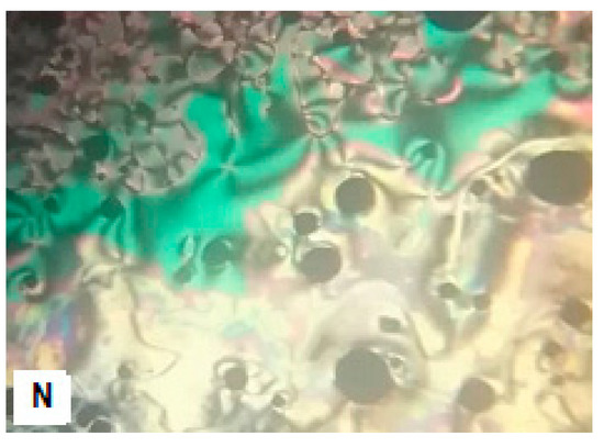 Figure 1 displays the DSC thermograms of typical compounds I6 and I8 during heating and cooling scans. It is evident that compounds display only one endotherm peak that is typical of crystal–isotropic transitions following heating. Both I6 and I8 compounds display two transition temperatures during the cooling cycle. The POM measurements show textures that support the formation of N mesophases (Figure 2). While n-hexyloxy and n-octyloxy derivatives show a nematic phase under a POM, n-hexadecyloxy derivatives do not show any liquid crystal phase. This demonstrates that, depending on the terminal chain length, these compounds possess monotropic characteristics with a mono-morphic phase. Table 1 provides a summary of the details on the transition temperatures and related enthalpy of all studied homologues series (In). To determine the effect of the terminal alkoxy chain length on the mesophase behavior, the transition temperatures of all the examined derivatives are graphically displayed in Figure 3.
