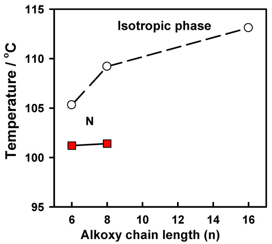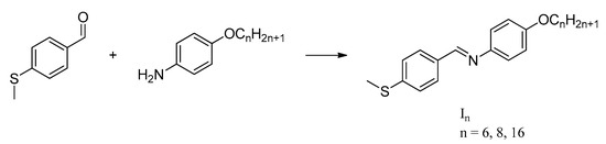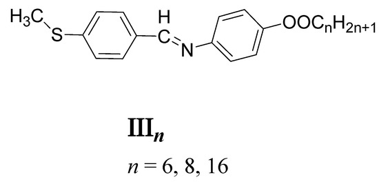 In another work [21], 4-(methylthio)benzylidene-4’-n-alkanoyloxyanilines (IIIn, Figure 5) were reported, and their mesomorphism investigated. It was found that the n-hexanoyloxy (III6) and n-octanoyloxy (III8) derivatives exhibited monotropic nematic phase, while the n-hexadecanoyloxy (III16) derivative showed non-mesomorphic behavior. The mesophase was disrupted for the longer terminal chain component, and the intermolecular interactions within the molecule were thought to be affected by the length of the molecular shape.