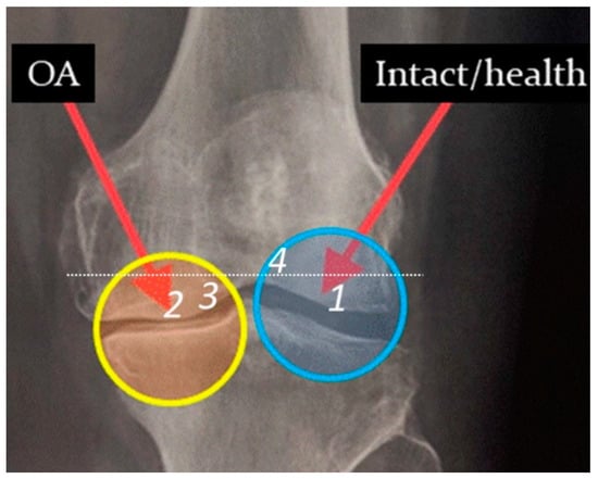 OA-damaged knee joint: different areas on proximal side of the femur: intact 1, sclerotic bone 2, and its vicinities 3. Dots show the position of the distal side (area 4) of saw-cuts under study.