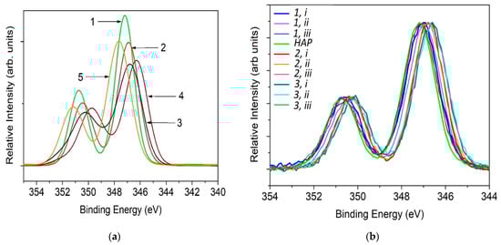 The comparison of Ca2+ 2p−13/2 BEs in calcium phosphates and carbonates in Table 3 shows that the carbonization gives rise to the Ca2+ 2p−13/2 Bes compared to HAP. The energy positions of the Ca2+ 2p−13/2,1/2 PE lines in CHAP (curve 5 inFigure 3a) are lower than those in HAP (curve 1). Thus, we infer that the replacement of by is not a source of Ca2+(X) in XPS, as accounting for this carbonization does not compensate the contribution of Ca2+(X) to the PE lines composition in Figure 4c.